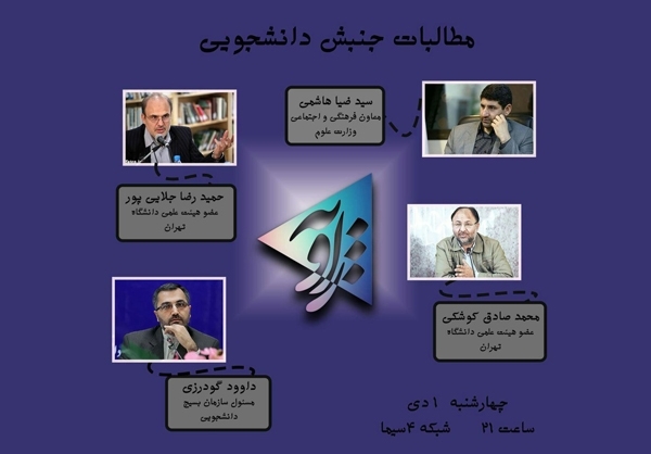 در این برنامه سیدضیاء هاشمی معاون فرهنگی و اجتماعی وزارت علوم، حمیدرضا جلاییپور عضو هیأت علمی دانشگاه تهران، محمدصادق کوشکی عضو هیأت علمی دانشگاه تهران و داوود گودرزی مسئول سازمان بسیج دانشجویی به مناظره خواهند پرداخت.