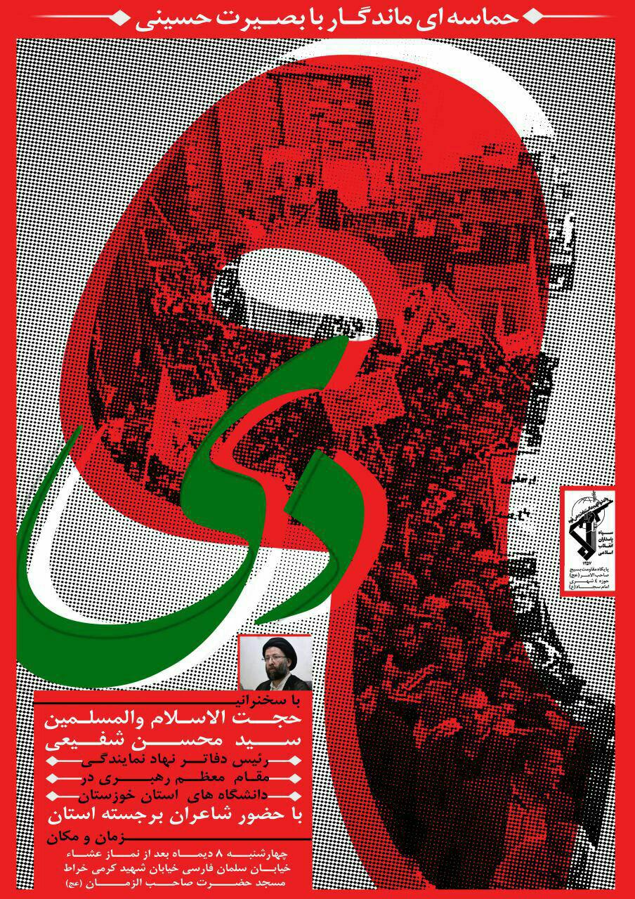 این مراسم که در آن شاعران برجسته خوزستانی نیز به شعرخوانی خواهند پرداخت. روز چهارشنبه مورخ 8 دی ماه بعد از نماز مغرب و عشا در خیابان سلمان فارسی خیابان شهید کرمی خراط مسجد حضرت صاحبالزمان(عج) برگزار خواهد شد.