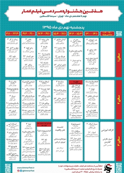 به گزارش حلقه وصل، هفتمین جشنواره فیلم مردمی عمار دقایقی قبل در سینما فلسطین تهران آغاز به کار کرد. ستاد خبری جشنواره نیز جدول برنامه اکران اولین روز (پنجشنبه نهم دیماه) هفتمین دوره جشنواره مردمی فیلم عمار را منتشر کرد: