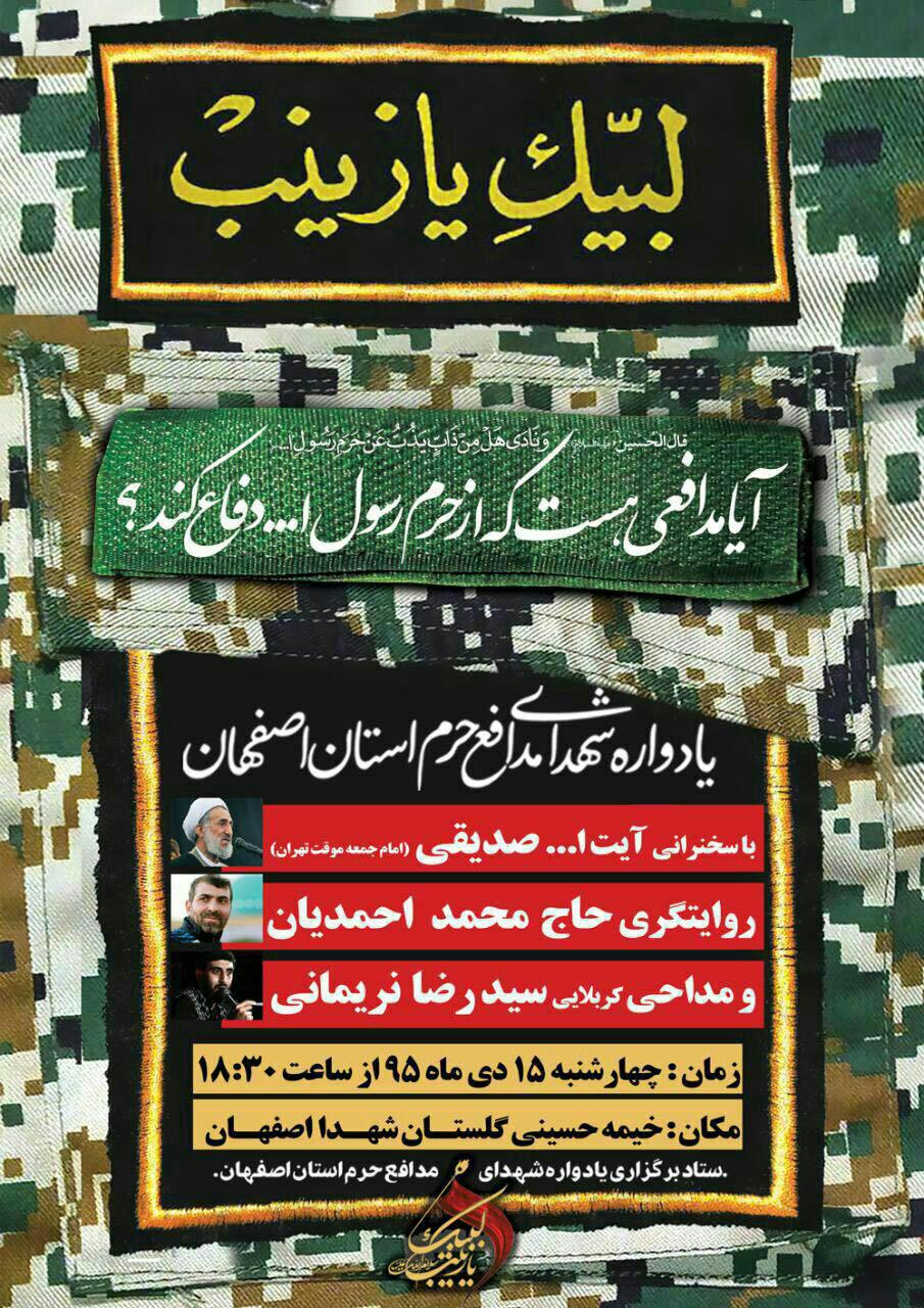 به گزارش سرویس استان های حلقه وصل، یادواره شهدای مدافع حرم استان اصفهان با سخنرانی آیت الله صدیقی و مداحی سید رضا نریمانی چهارشنبه 15 دی ماه برگزار می شود.