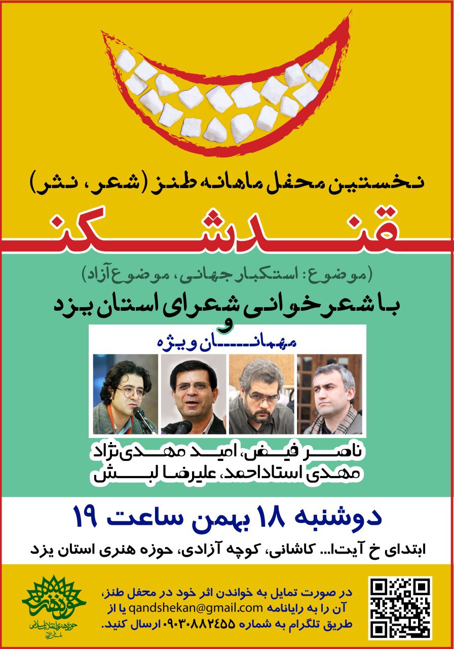 وحید حسنی کارشناس مسئول واحد آفرینش های ادبی حوزه هنری یزد به حلقه وصل گفت: نخستین محفل ماهانه طنز با عنوان«قند شکن» عصر امروز برگزار می شود.