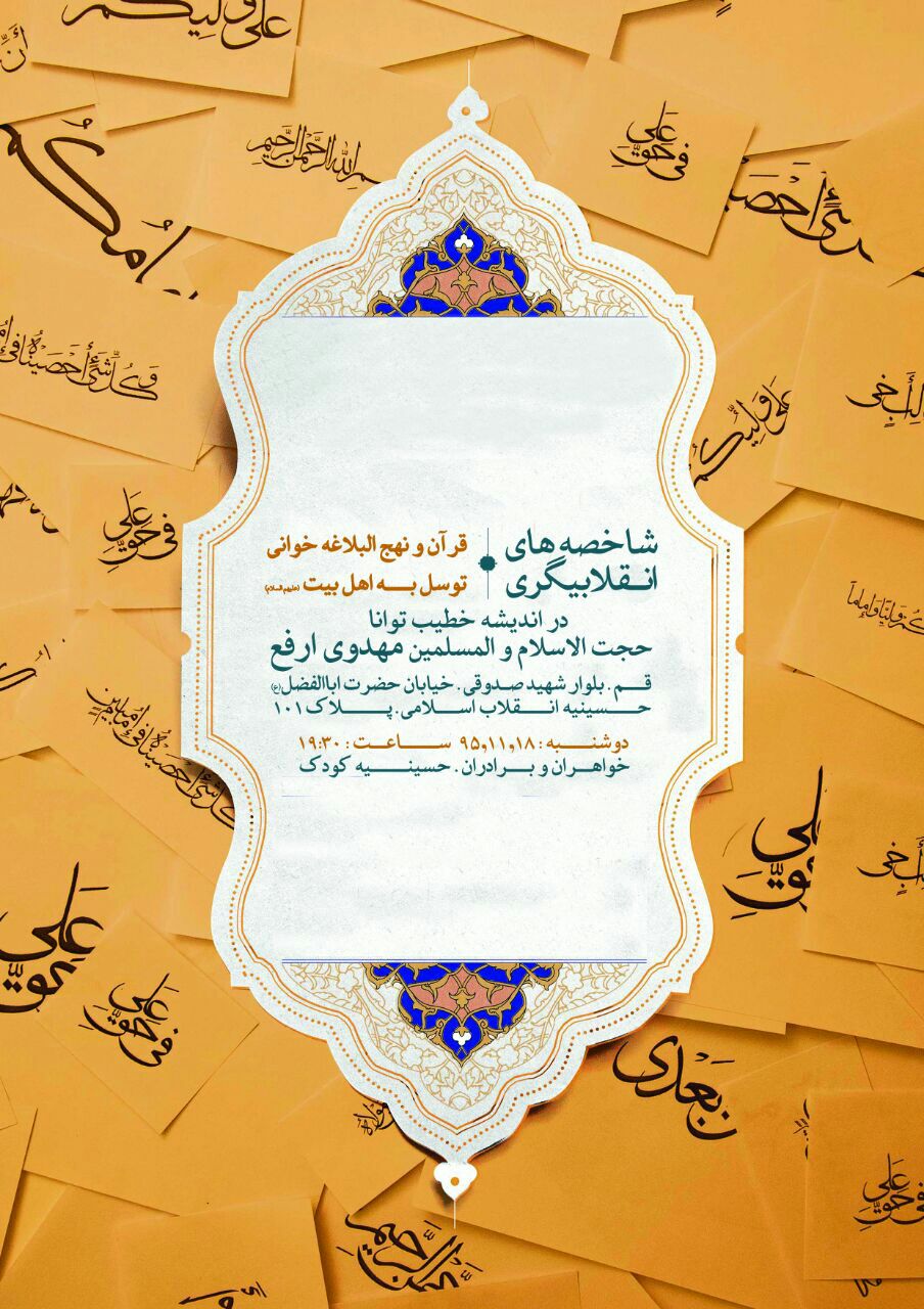 این مراسم با حضور حجت الاسلام مهدوی ارفع با موضوع قران و نهج البلاغه خوانی و توسل به اهل بیت(ع) برگزار می گردد.