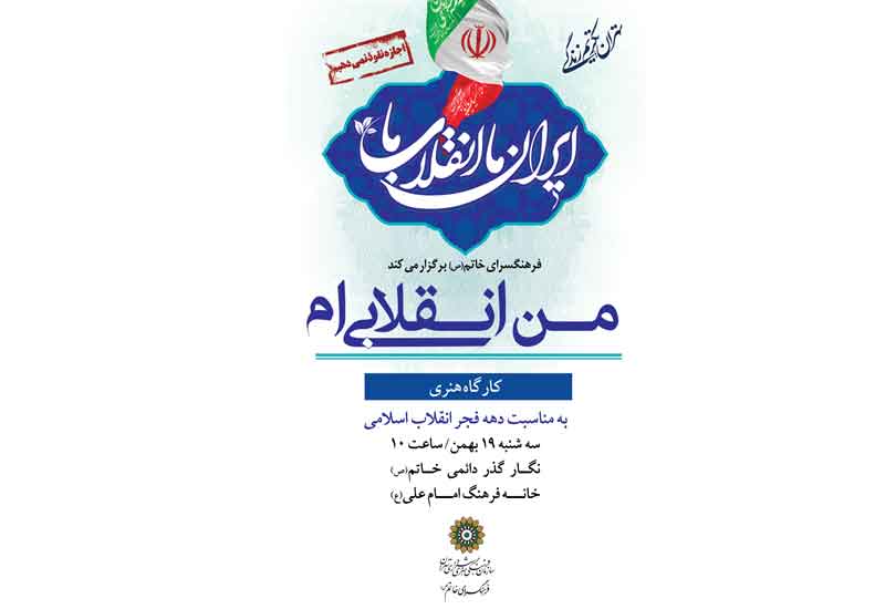 کارگاه زنده هنری «من انقلابیام» با مشارکت هنرستان فنی حرفهای دخترانه حضرت مریم، روز سهشنبه 19 بهمن ساعت 10 در خانه فرهنگ امام علی(ع) به نشانی یافتآباد، میدان الغدیر، بلوار الغدیر شمالی، میدان جانبازان، جنب مجتمع شهید مختار سلیمانی برگزار میشود و نمایشگاه آثار نیز از این تاریخ میزبان علاقمندان است.