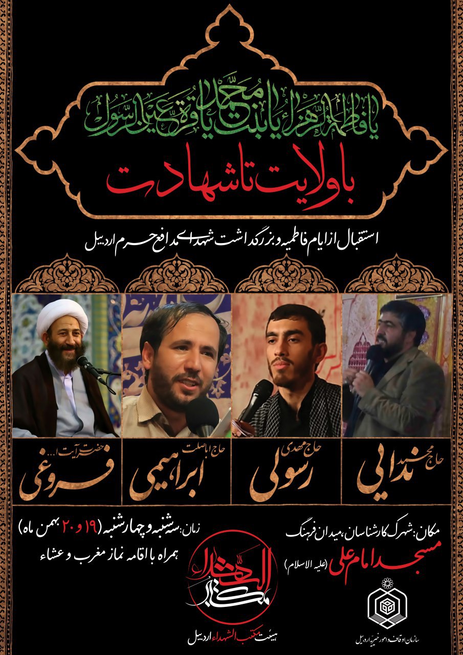 به گزارش سرویس استان های حلقه وصل، به همت هیئت مکتب الشهدا اردبیل مراسم استقبال از ایام فاطمیه و و بزرگداشت شهدای مدافع حرم اردبیل برگزار می شود.