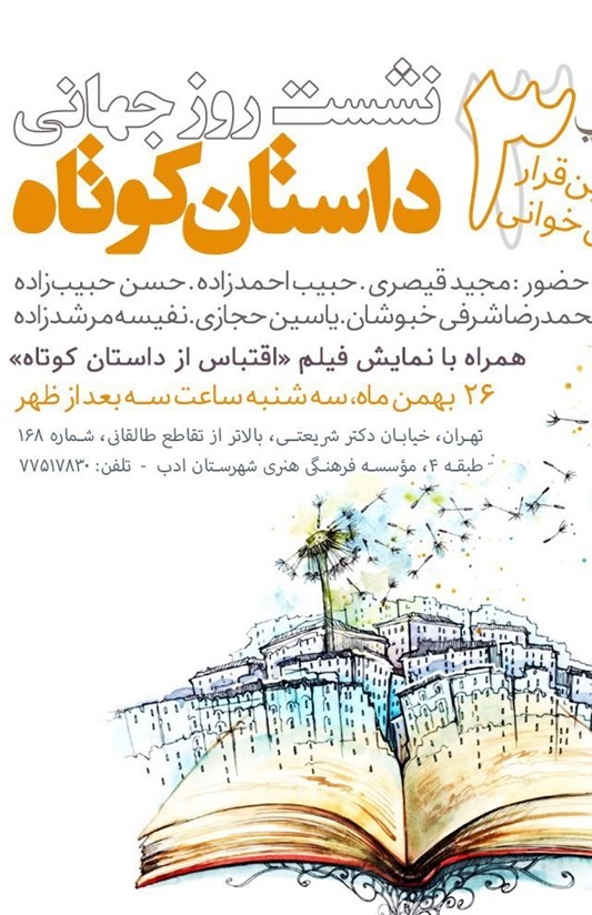 علاقهمندان میتوانند برای شرکت در این نشست به مؤسسه شهرستان ادب به نشانی تهران، خیابان دکتر شریعتی، بالاتر از تقاطع طالقانی، شماره 168، طبقه 4 مراجعه کنند.