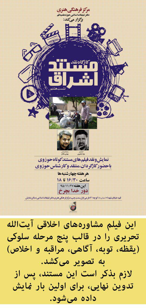 به گزارش حلقه وصل، در هشتمین نشست از سلسله نشست های نقد مستند اشراق، مستند «دورخدا بچرخ» ساخته جواد یقموری نقد می شود.