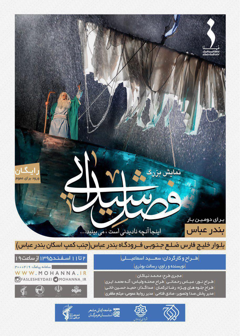 فصل شیدایی با حمایت سازمان هنری رسانه ای اوج و با مشارکت مالی موسسه الهام فنون، در بندرعباس از تاریخ دوم تا یازدهم اسفند ماه 1395 به آدرس، بلوار خلیج فارس – ضلع جنوبی فرودگاه بندرعباس (جنب کمپ اسکان بندرعباس ) اجرا خواهد شد.