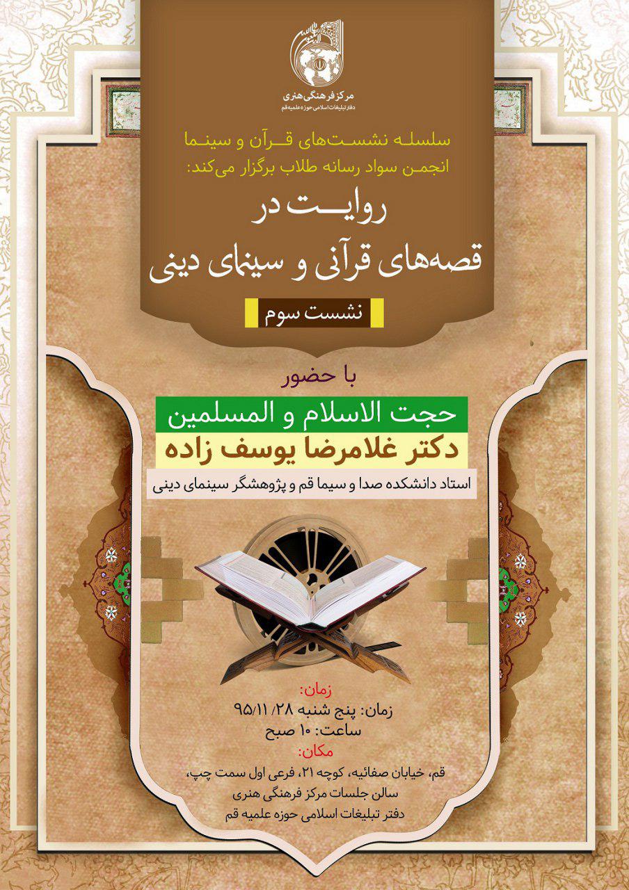 در این نشست حجت الاسلام غلامرضا یوسف زاده استاد دانشگاه صدا و سیما قم و پژوهشگر سینمای دینی به بررسی روایت در قصه های قرآنی و سینمای دینی می پردازد.