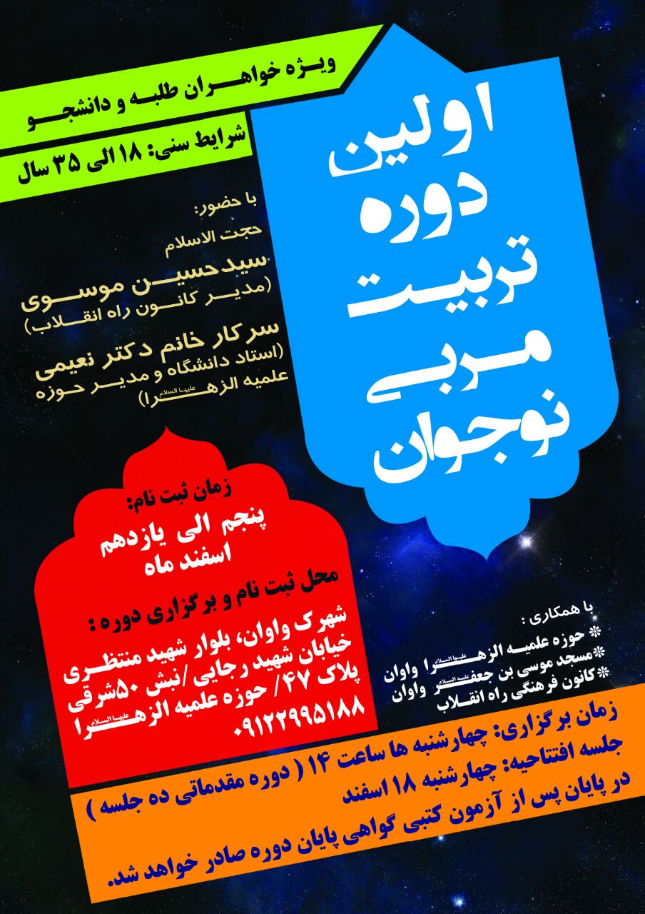 دوره تربیت مربی نوجوان باهمکاری کانون فرهنگی راه انقلاب، مسجد موسی بن جعفر(ع)واوان و حوزه علمیه الزهرا(س)برگزار می شود.
