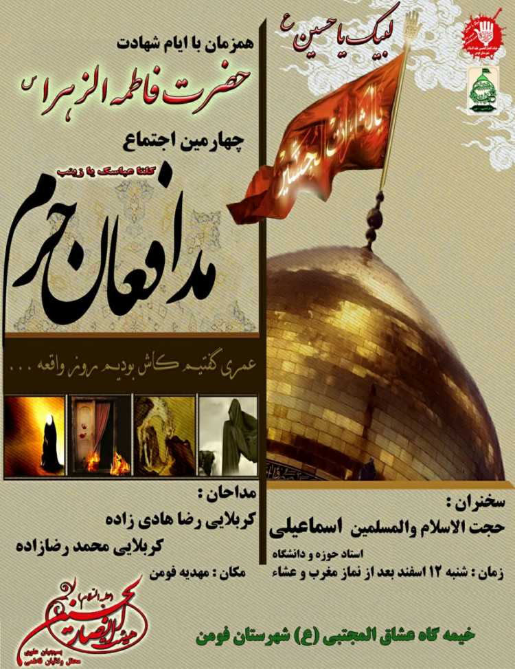 به گزارش خبرنگار سرویس استان های حلقه وصل، چهارمین اجتماع مدافعان حرم به همت هیئت انصارالحسین(ع) و خیمه گاه عشاق المجتبی(ع) فومن همزمان با شب شهادت حضرت زهرا (س) سه شنبه ۱۲ اسفندماه بعد از نماز مغرب و عشاء برگزار می گردد.