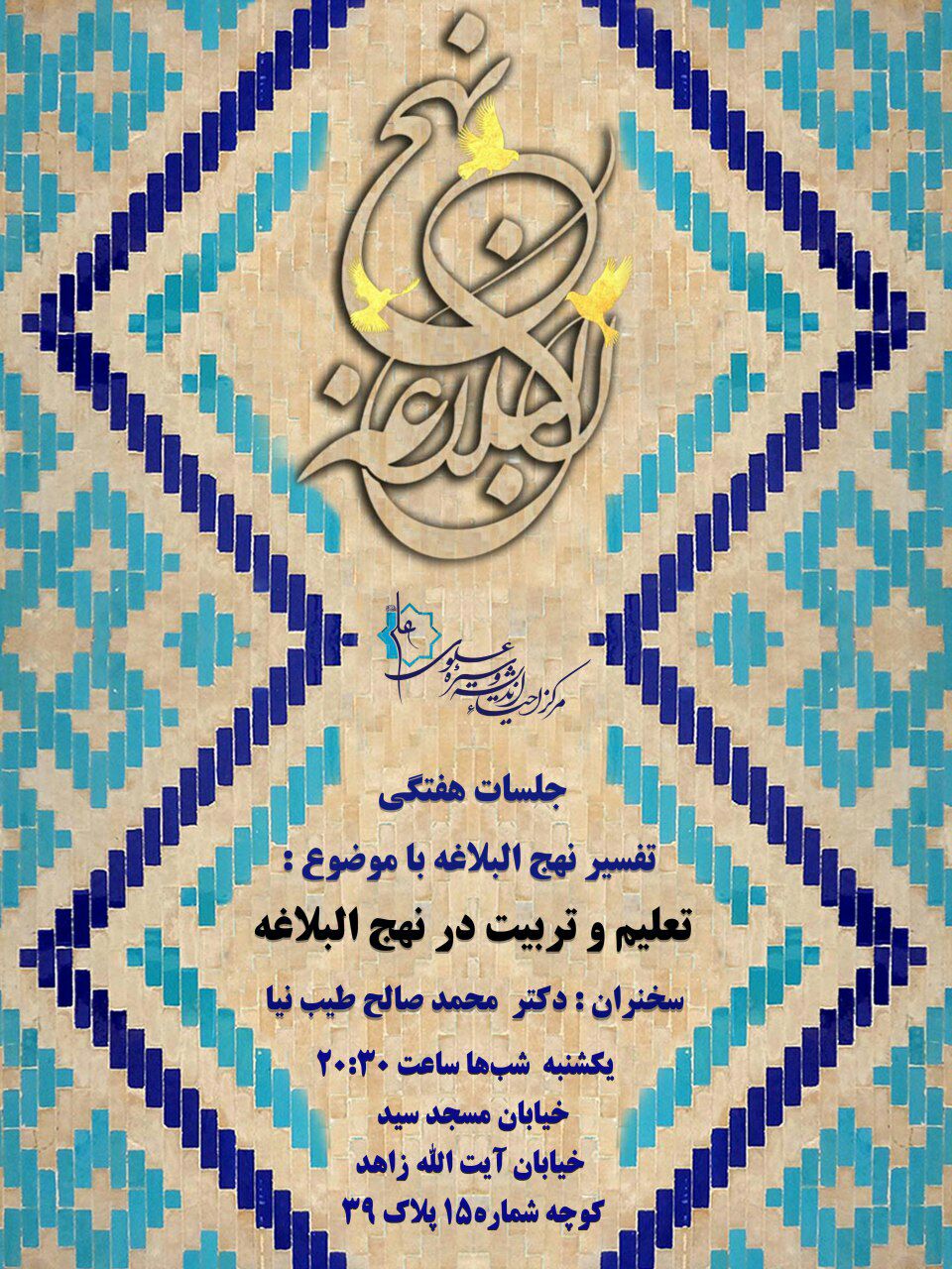 وی ادامه داد: جلسات نیز یکشنبه شب ها از ساعت 20:30 در خیابان مسجد سید، خیابان آیت الله زاهد کوچه شماره 15 پلاک 39 برگزار می گردد.