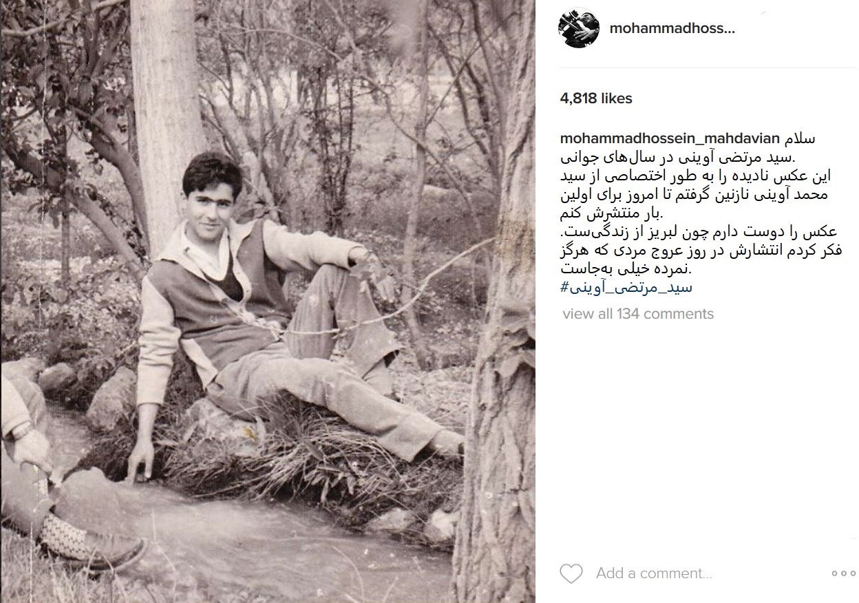 وی در پیوست این عکس آورده است:«سلام، سید مرتضی آوینی در سالهای جوانی. این عکس نادیده را به طور اختصاصی از سید محمد آوینی نازنین گرفتم تا امروز برای اولین بار منتشرش کنم. عکس را دوست دارم چون لبریز از زندگیست. فکر کردم انتشارش در روز عروج مردی که هرگز نمرده خیلی بهجاست»