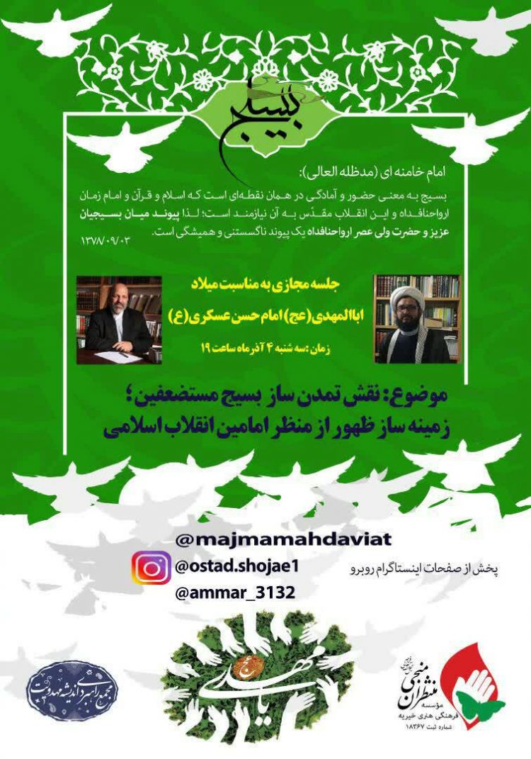 در این نشست موضوع «نقش تمدن ساز بسیج مستضعفین؛زمینه ساز ظهور از منظر امامین انقلاب اسلامی» از ساعت 19 به صورت لایو مورد بررسی قرار می گیرد.