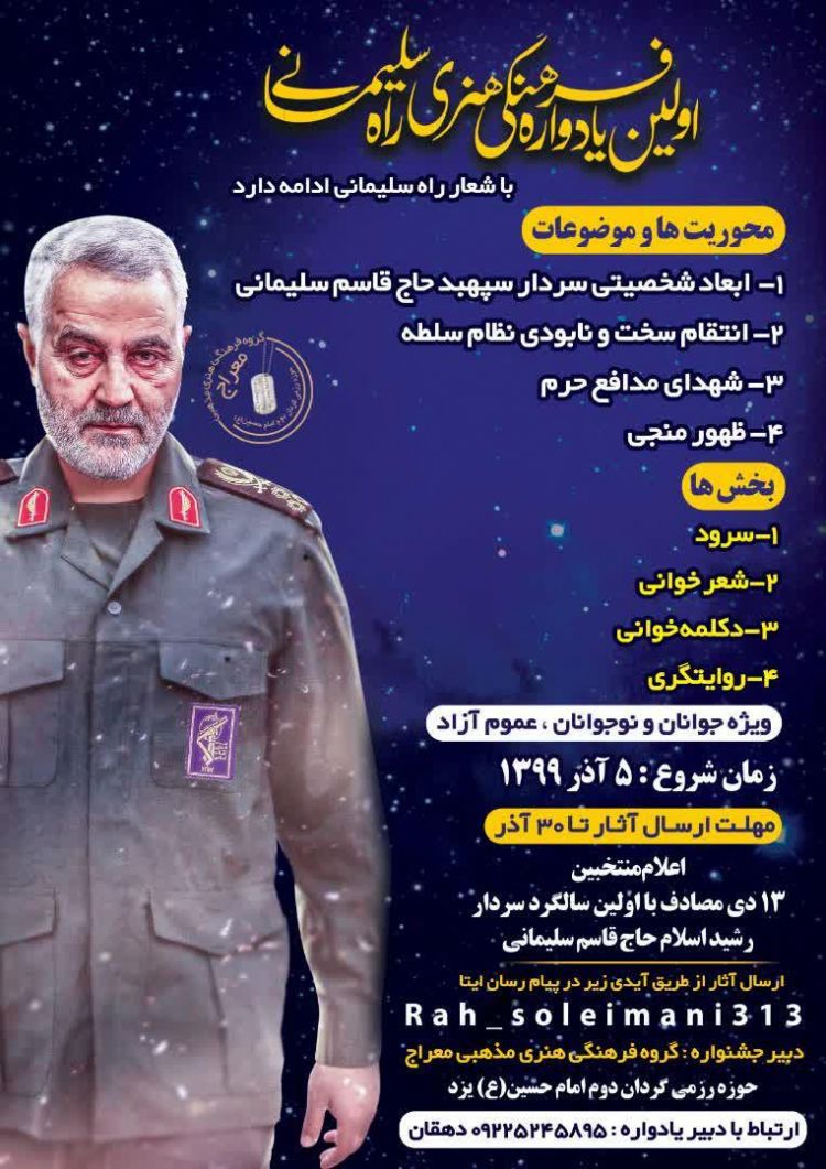 حلقه وصل: در آستانه ی نخستین سالگرد شهادت سردار آسمانی شهید حاج قاسم سلیمانی از سوی گروه فرهنگی هنری مذهبی «معراج» یزد فراخوان اولین یادواره «راه سلیمانی» منتشر شد.