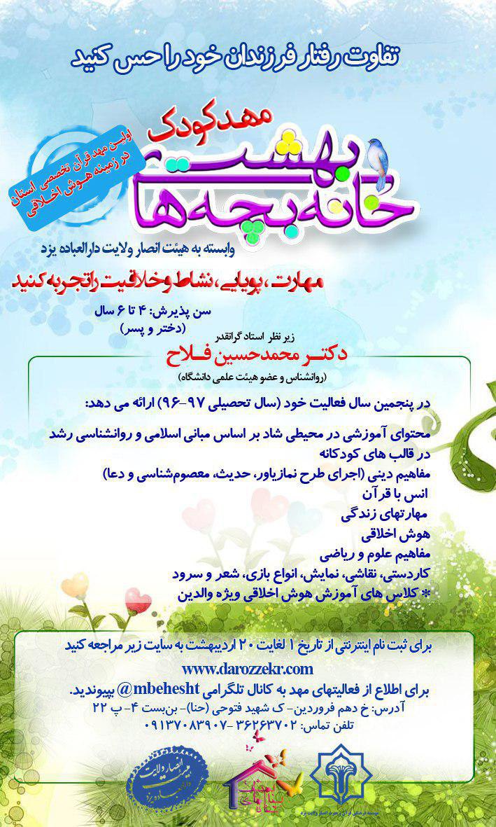 مدیر مهد «خانه بچه های بهشت» یزد افزود: مربیان طی دو سال زیر نظر دکتر محمد حسین فلاح اموزش دیدند و محتواهای خوب و مناسبی نیز تهیه و آماده شده تا به بچه ها اموزش داده شود.