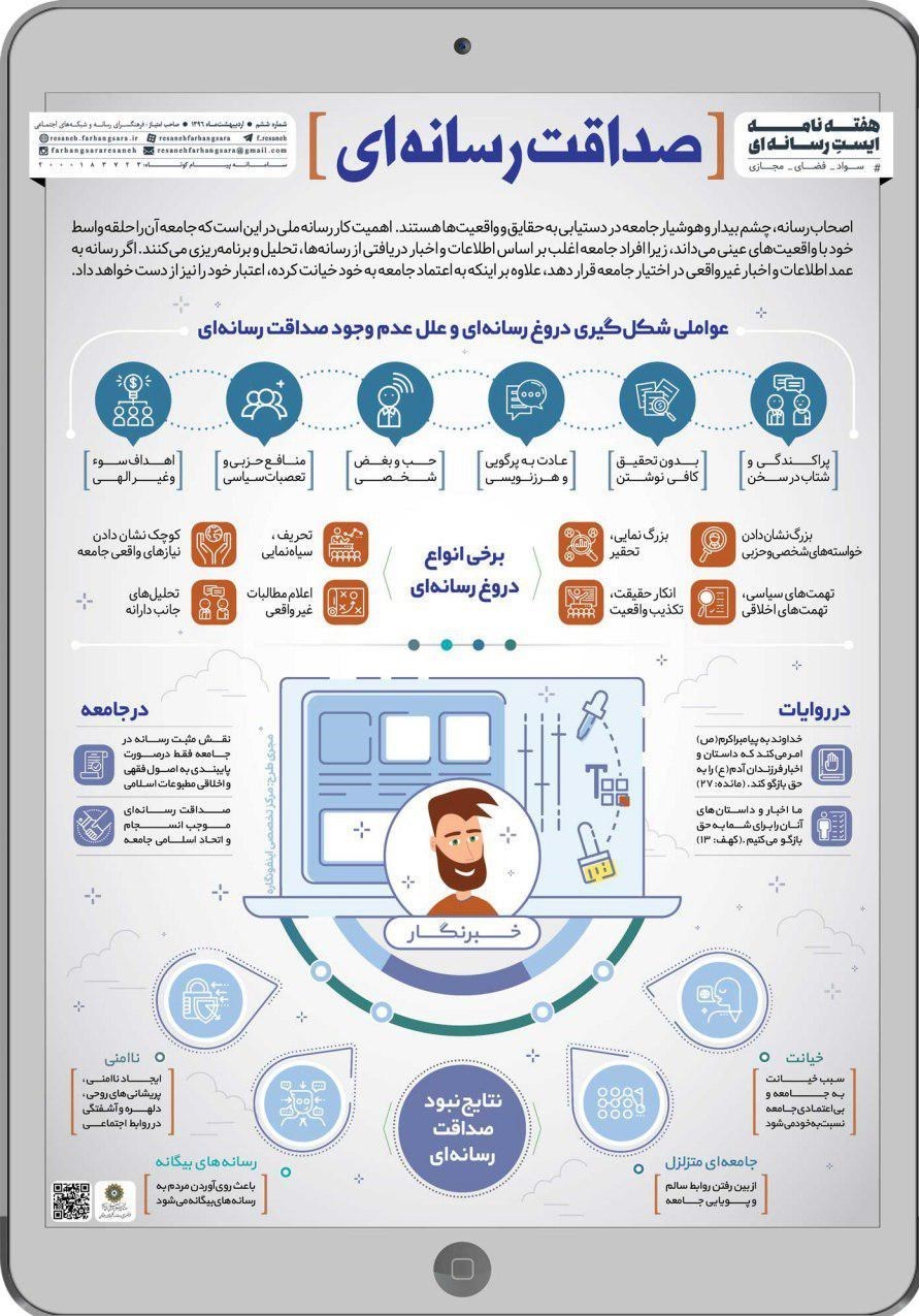 به گزارش حلقه وصل، فرهنگسرای رسانه با انتشار اینفوگرافیکی به فضای انتخاباتی کشور به تاکید بر «صداقت رسانهای» پرداخت. عوامل شکلگیری دروغ رسانهای و علل عدم وجود صداقت رسانهای مهمترین بخش این اینفو گرافیک است.
