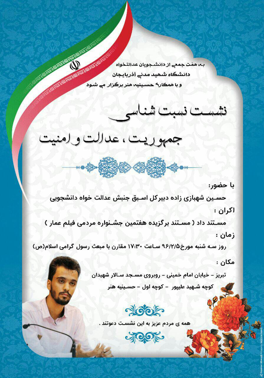 این نشست با حضور حسین شهبازی زاده دبیر کل اسبق جنبش عدالتخواه دانشجویی از ساعت 17:30 اغاز و اکران مستندبرگزیده هفتمین جشنواره مردمی فیلم عمار با عنوان «داد» نیز انجام می گیرد.