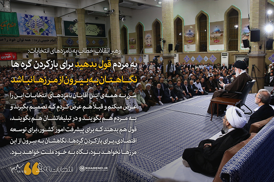 به گزارش حلقه وصل، حضرت آیت الله خامنه ای: «من به همهی این آقایان محترمی که نامزد انتخابات ریاست جمهوری هستند این را عرض میکنم -حرفی است که بارها گفتهایم- تصمیم بگیرند، به مردم هم بگویند، در تبلیغاتشان هم بگویند، قول هم بدهند که برای پیشرفت امور کشور، برای توسعهی اقتصادی، برای باز کردن گرهها، نگاهشان به بیرون از این مرزها نخواهد بود، نگاه به خود ملّت خواهد بود. تواناییهای ما زیاد است، ظرفیّتهای ما زیاد است؛ توجّه به این ظرفیّتها، استفادهی از این ظرفیّتها، برنامهریزی عاقلانه و مدبّرانه برای استفادهی از این ظرفیّتها میتواند کشور را به اقتدار و استحکامِ ساخت درونی برساند؛ و این، آن چیزی است که دشمن را مأیوس میکند، این، آن چیزی است که به کشور و ملّت و نظام اسلامی، به توفیق الهی مصونیّت خواهد داد.» ۱۳۹۶/۰۲/۰۵
