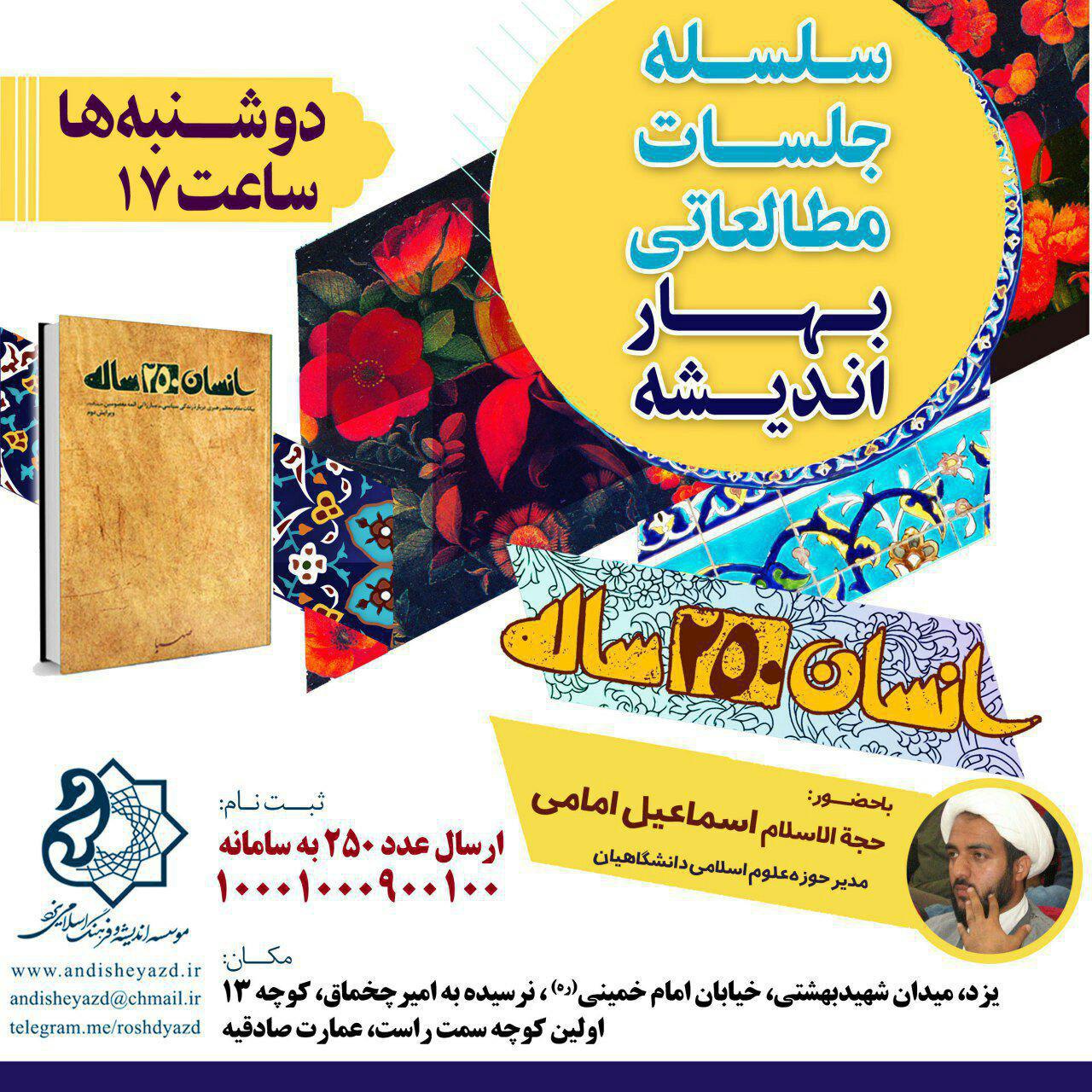 جواد کوراغلی، مسئول روابط عمومی مؤسسه اندیشه و فرهنگ اسلامی یزد به حلقه وصل گفت: سلسله جلسات مطالعاتی«انسان 250 ساله» با حضور حجت الاسلام اسماعیل امامی برگزار می گردد.