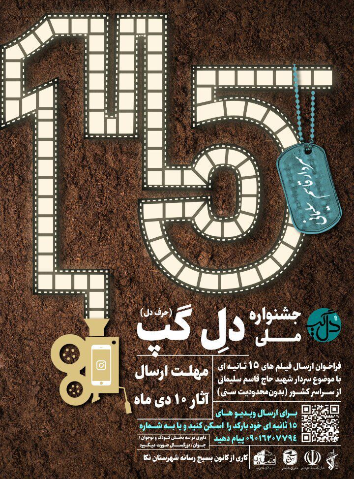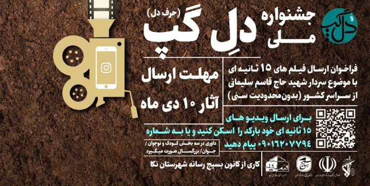 گفتنی ست، جشنواره ملی «دل گپ» با موضوع فیلم کوتاه 15 ثانیه ای از سردار سلیمانی به همت بسیج رسانه نکا و با تلاش و همکاری بسیج رسانه مازندران، سپاه نکا و گروه فرهنگی رسانه ای سدید اصفهان برگزار می شود.