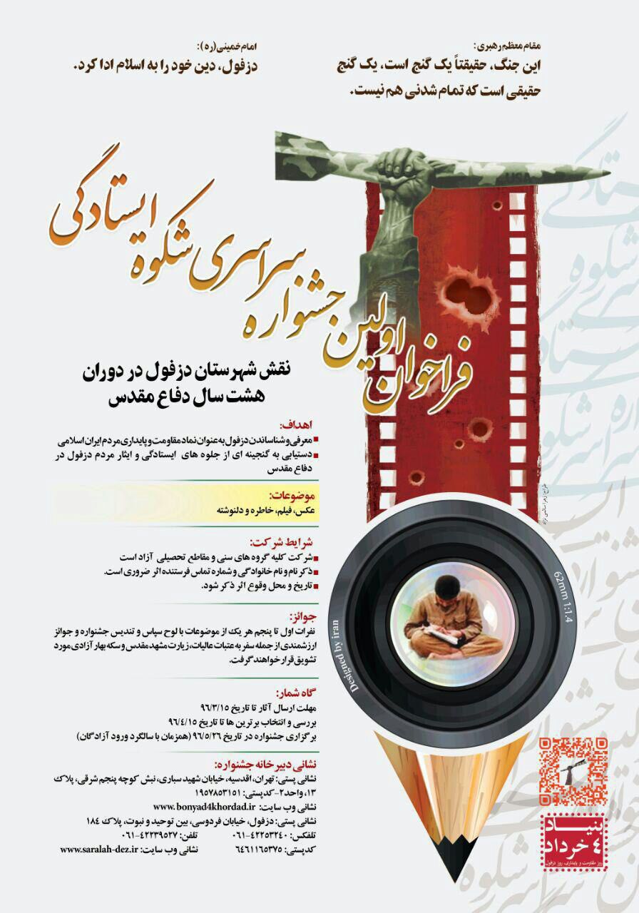 این جشنواره با محوریت نقش شهرستان دزفول در دوران هشت سال دفاع مقدس در قالب عکس، فیلم، خاطره و دلنوشته برگزار می شود.