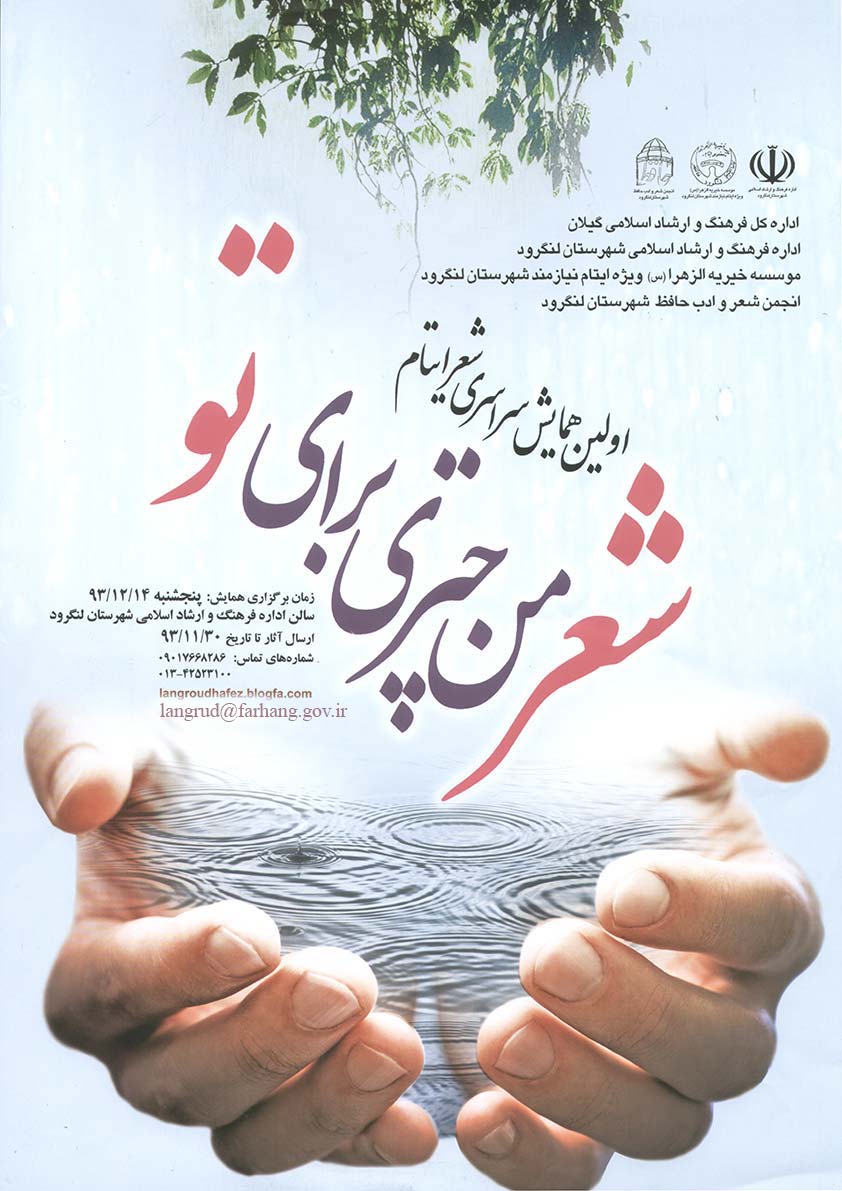 یادآور میشود، نخستین همایش سراسری شعر ایتام «شعر من چتری برای تو» از سوی ادارهکل فرهنگ و ارشاد اسلامی گیلان، با همکاری انجمن شعر و ادب حافظ و مؤسسه خیریه الزهرا(س) شهرستان لنگرود برگزار شد.