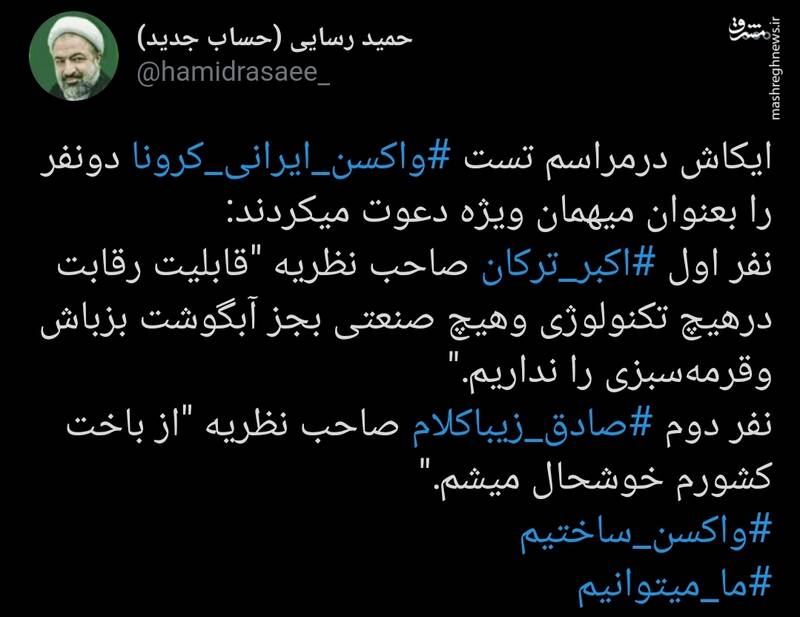 به گزارش حلقه وصل، حمید رسایی در توییتر نوشت: ایکاش در مراسم تست واکسن ایرانی کرونا دونفر را بعنوان میهمان ویژه دعوت میکردند: