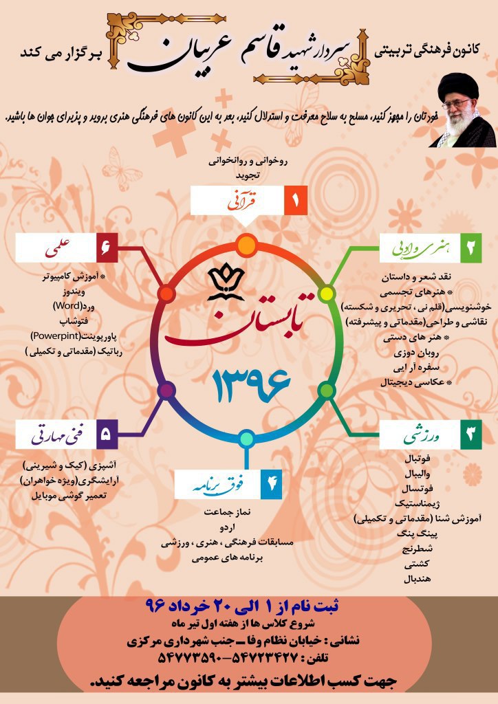 وی بیان داشت: ثبت نام کلاس های تابستانی کانون آغاز و تا 20 خردادماه ادامه می یابد و شروع کلاس ها نیز هفته نخست تیرماه می باشد.