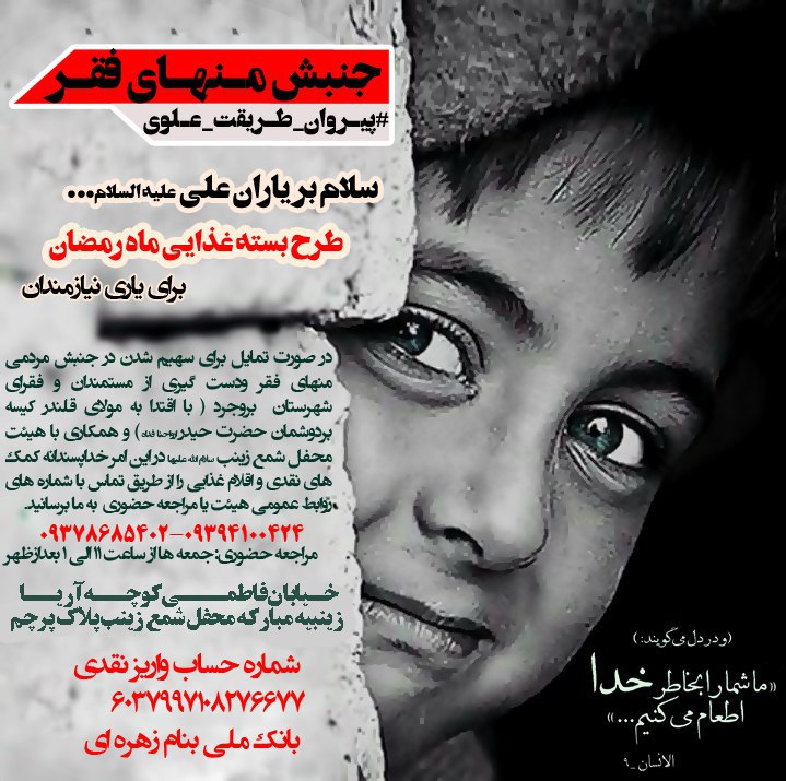 وی ادامه داد: در ماه مبارک رمضان نیز این جنبش آغاز به کار کرده و علاقه مندان و خیرین می توانند کمک های نقدی خود را به شماره حساب 6037997108276677 واریز و یا اقلام غذایی خود را به آدرس خیابان فاطمی کوچه آریا، زینبیه مبارکه محفل شمع زینب(س) ارسال نمایند.