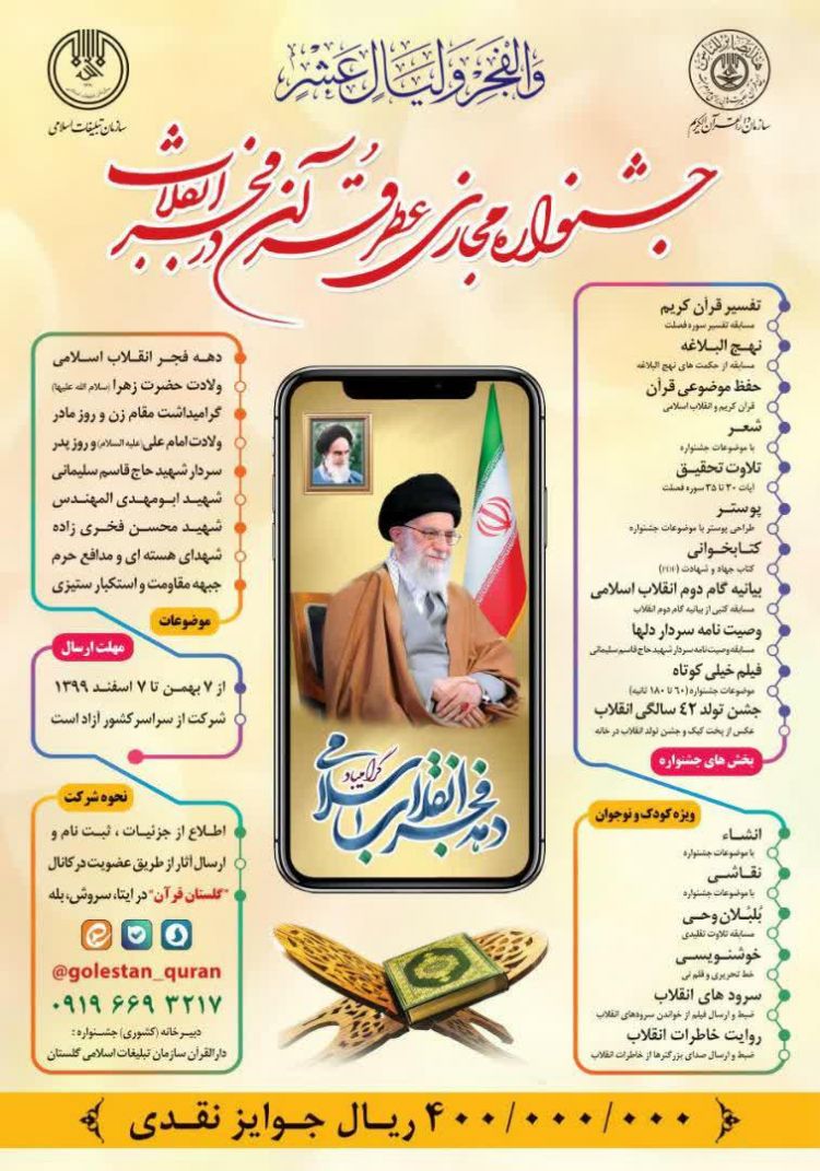 حسینیواعظ در پایان تصریح کرد: جشنواره مجازی عطر قرآن در فجر انقلاب از ۷ بهمنماه کار خود را آغاز خواهد کرد و تا ۷ اسفندماه ۱۳۹۹ ادامه خواهد داشت. برای برگزیدگان این جشنواره بیش از ۴۰۰.۰۰۰.۰۰۰ ریال جوایز نقدی در نظر گرفته شده است.