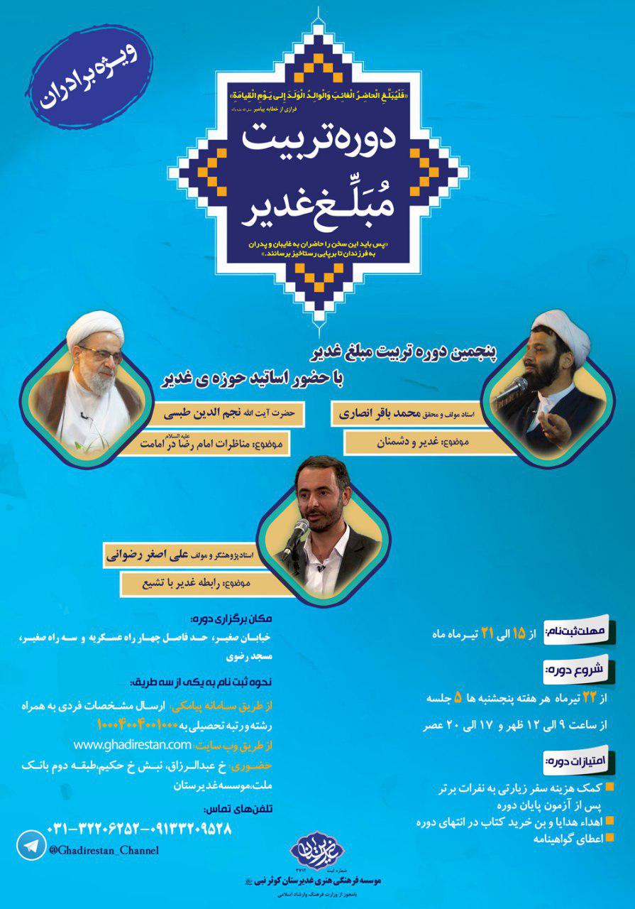 علاقهمندان به معارف غدیر میتوانند با شماره تلفنهای: 03132206252 و 09133209528 برای شرکت در این دوره تماس بگیرند.