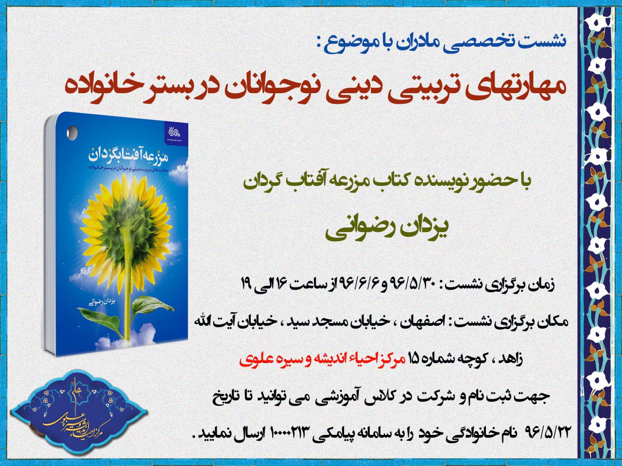 در این ویژه برنامه یزدان رضوانی نویسنده کتاب «مزرعه آفتابگردان» حضور خواهد یافت و علاقه مندان نیز جهت ثبت نام می توانند تا 22 مردادماه مشخصات خود را به سامانه 10000213 ارسال نمایند.