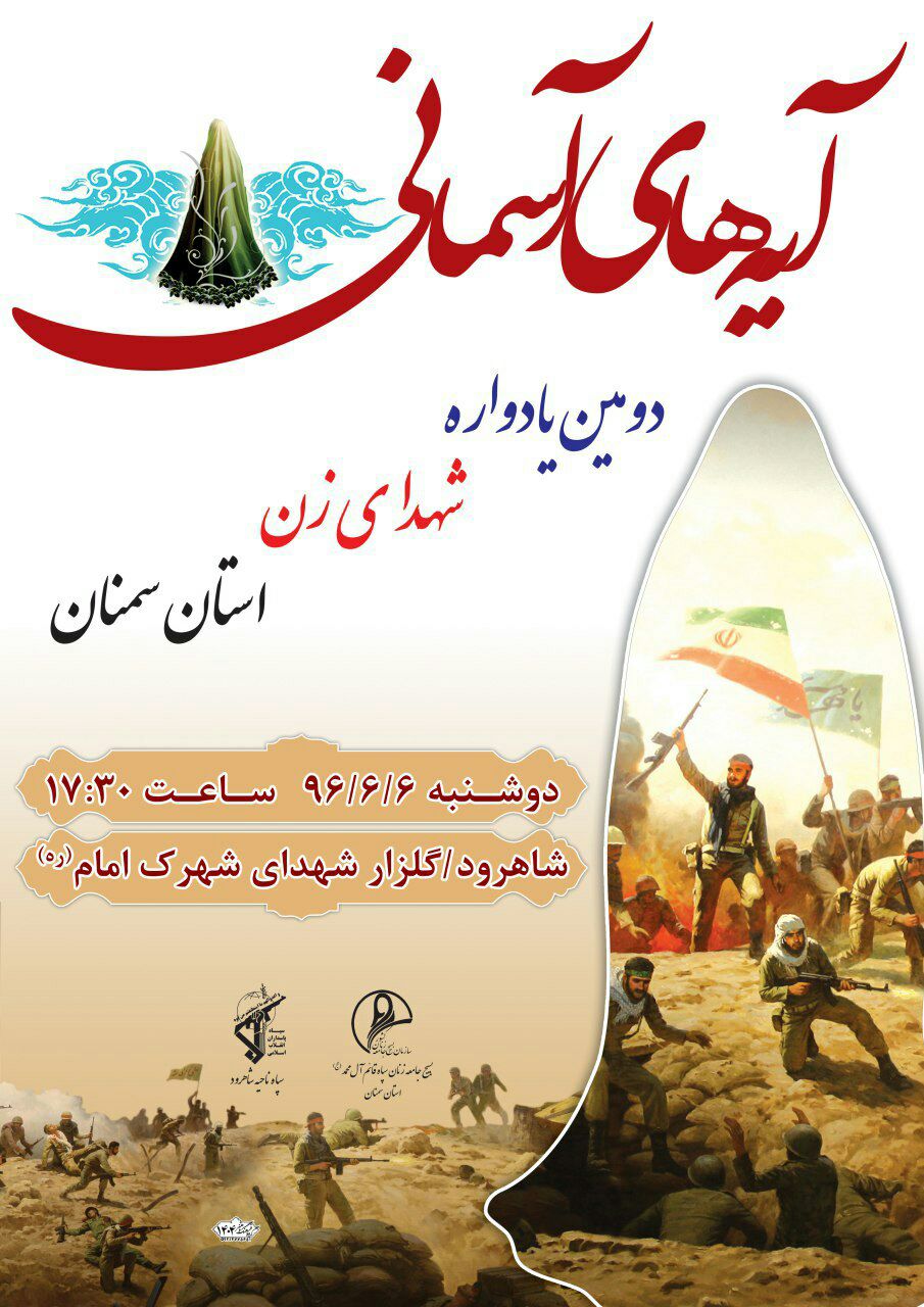 آیه های آسمانی دومین یادواره 17 زن شهیده استان سمنان است که با سخنرانی دکتر خطیب زاده و مداحی علی اکبر نظری همراه است.