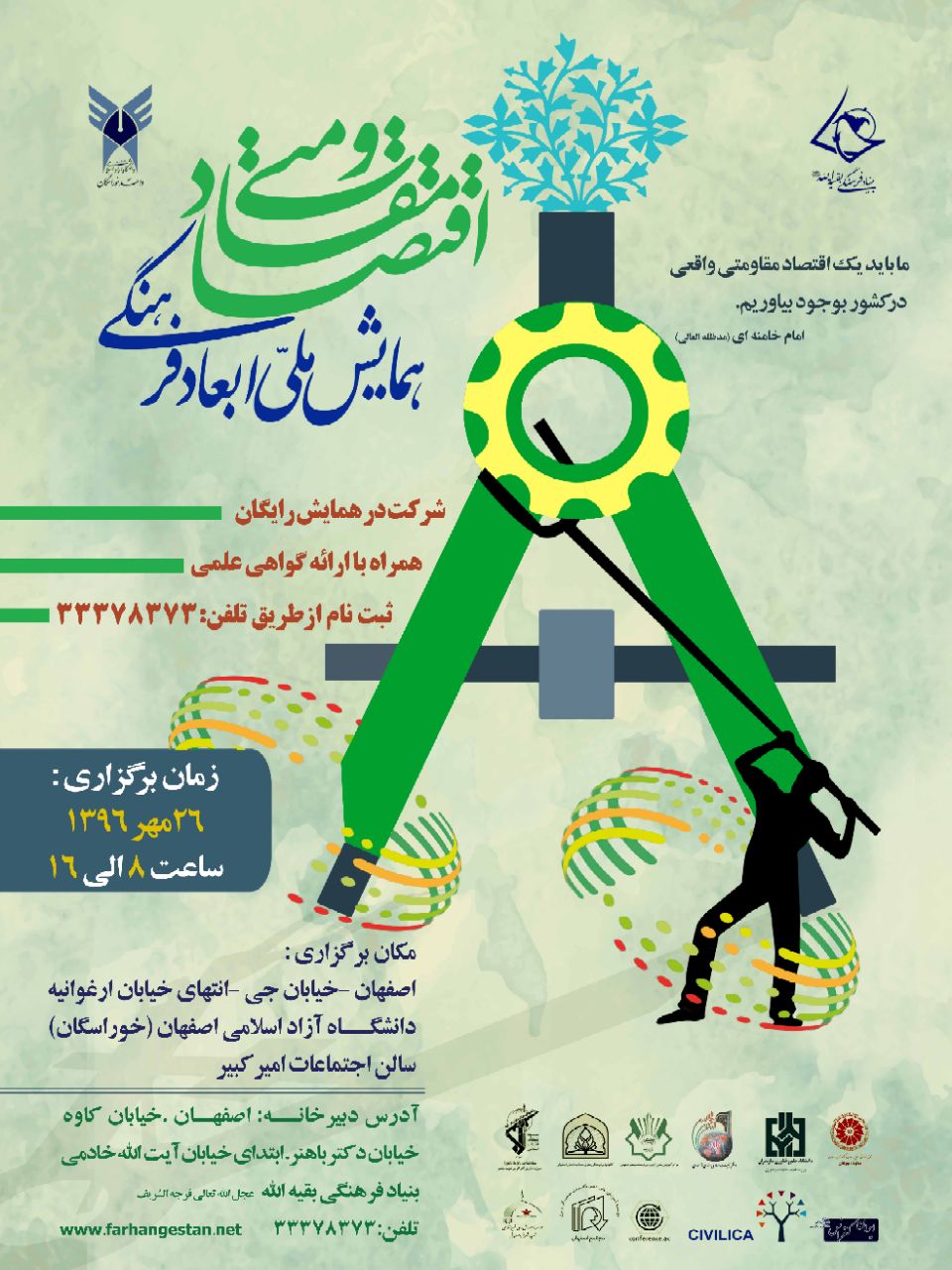 جوانی بیان داشت: هدف از برگزاری این همایش ملی نیز اشاعه و ترویج فرهنگ اقتصاد مقاومتی، گفتمان سازی، نهادینه کردن و تبیین مؤلفه های پویای فرهنگی مؤثر در پیاده سازی اقتصاد مقاومتی، تبیین نقش فرهنگ در مقاوم سازی اقتصاد و تبیین نقش سازمان ها، نهادها و مؤسسات فرهنگی در نهادینه کردن اقتصاد مقاومتی از سوی بنیاد فرهنگی بقیةالله(عج) اصفهان برگزار می گردد.