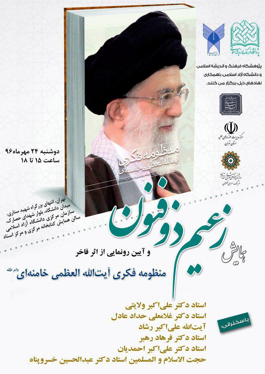 همچنین در این مراسم از کتاب «منظومه فکری آیتالله العظمی خامنهای» تألیف عبدالحسین خسروپناه رونمایی خواهد شد.