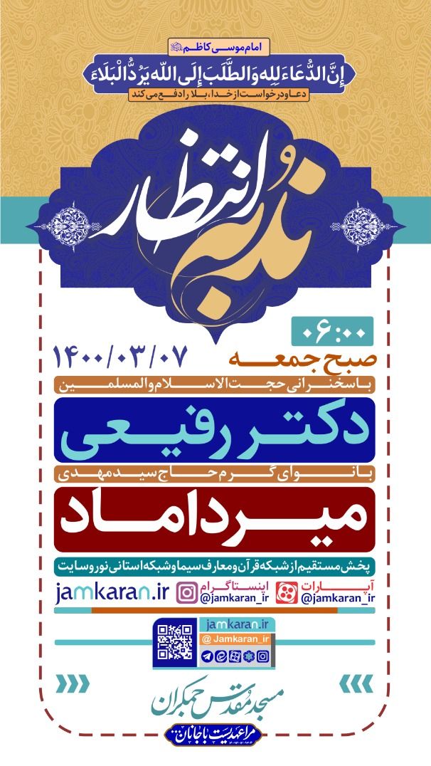 در نهایت روز جمعه هفتم اردیبهشتماه مراسم قرائت دعای ندبه با سخنرانی حجتالاسلام ناصر رفیعی و قرائت دعا سیدمهدی میرداماد از ساعت ۶ صبح برگزار خواهد شد. این مراسم از شبکه قرآن و شبکه استانی نور پخش زنده خواهد شد.