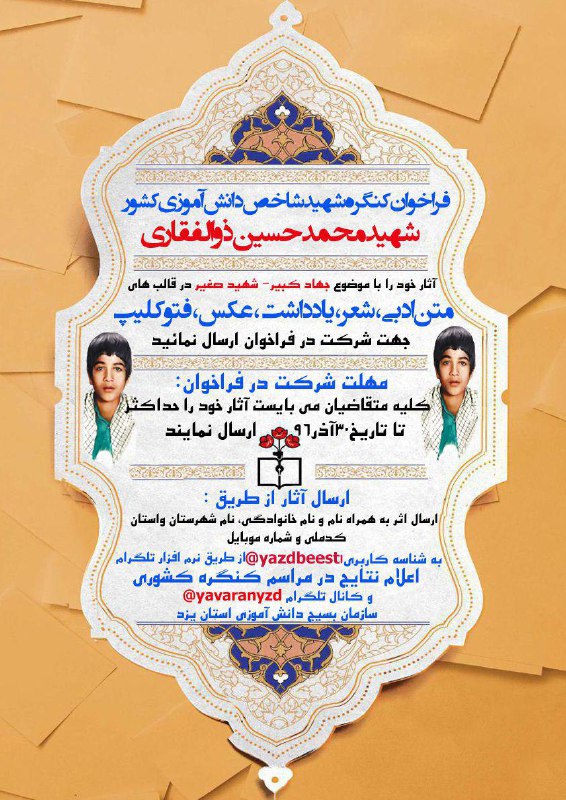 علاقمندان به شرکت در این فراخوان میتوانند آثار خود را در قالبهای متن ادبی، شعر، یادداشت، عکس و فتو کلیپ با موضوع «جهاد کبیر - شهید صغیر» حداکثر تا تاریخ 30 آذر ماه به همراه مشخصات فردی خود به آدرس تلگرامی @Yazdbeesti و یا @yavaranyzd ارسال کنند.