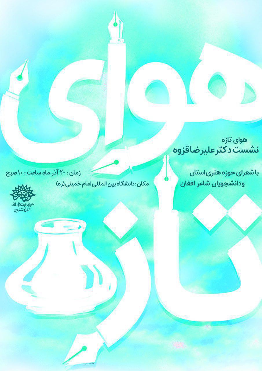 به گزارش سرویس استان های حلقه وصل، «هوای تازه» عنوان نشست شاعران و داستان نویسان حوزه هنری قزوین است که با حضور علیرضا قزوه برگزار می شود.