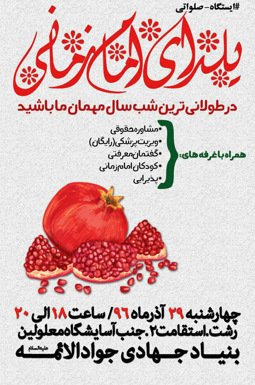 وی ادامه داد: این برنامه در قالب ایستگاه صلواتی که شامل هفت غرفه از جمله گفتمان معرفتی، مشاوره حقوقی، ویزیت پزشکی، پذیرایی، کودکان امام زمانی و رفع شبهات می شود شب یلدا یعنی چهارشنبه 29 آذرماه برگزار می شود.