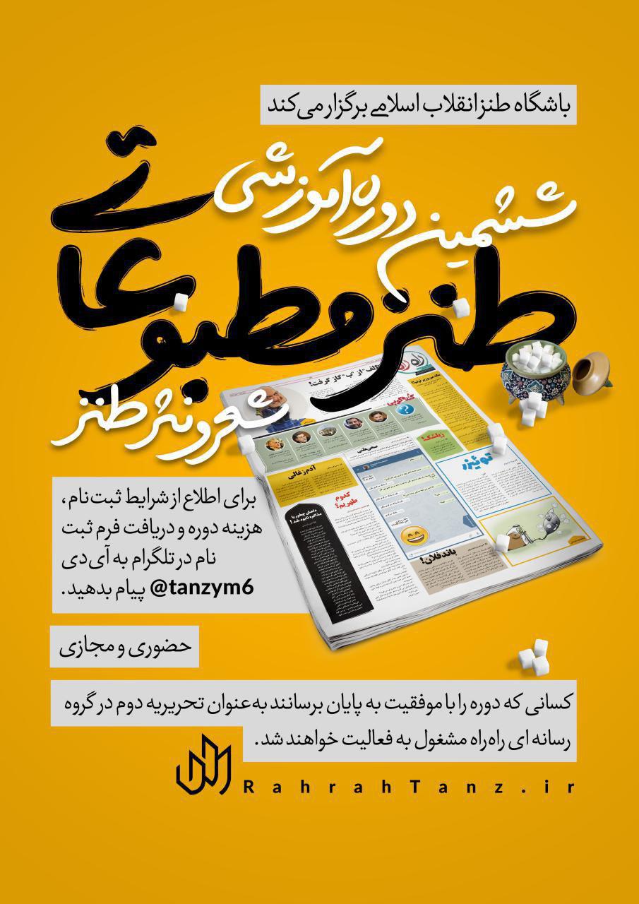 به گزارش حلقه وصل، ششمین دوره آموزشی طنز مطبوعاتی به همت باشگاه طنز و کاریکاتور انقلاب اسلامی، در دو شاخه شعر طنز و نثر طنز و با هدف آموزش نویسندگی و طنزپردازی در هشت جلسه برگزار میشود.