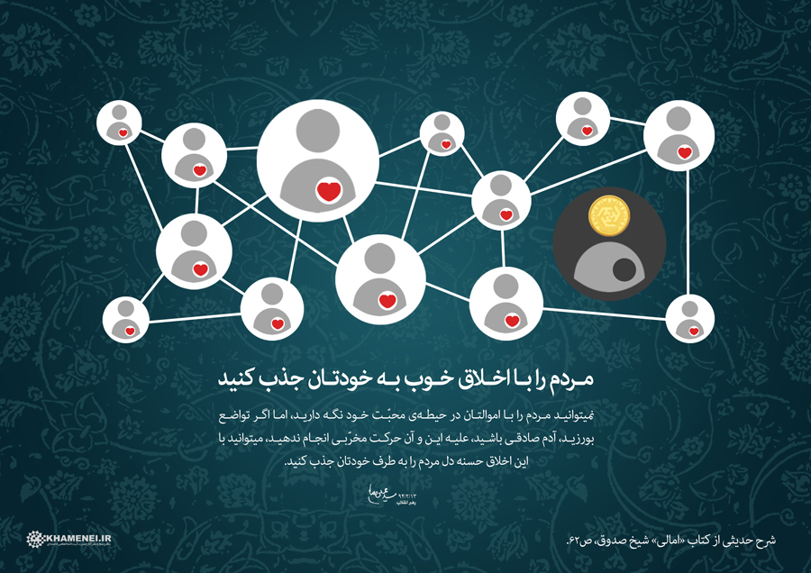 به گزارش حلقه وصل، حضرت آیتالله خامنهای:«نمیتوانید مردم را با اموالتان در حیطهی محبّت خود نگه دارید، اما اگر تواضع بورزید، آدم صادقی باشید، علیه این و آن حرکت مخربّی انجام ندهید، میتوانید با این اخلاق حسنه دل مردم را به طرف خودتان جذب کنید.» ۹۴/۰۲/۱۳
