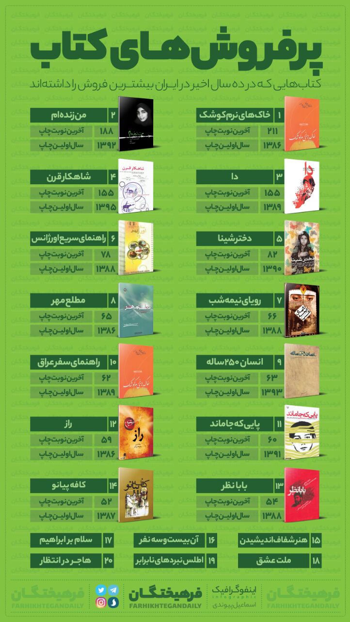 در اینفوگراف حاضر پرفروش ترین کتابهای ده سال اخیر نشان داده شده و در میان این کتاب ها خاک های نرم کوشک و من زنده ام به ترتیب اولین و دومین کتاب پرفروش ده سال اخیر بوده اند.