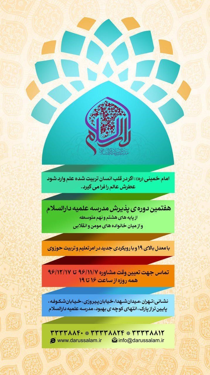 وی یادآور شد: علاقهمندان جهت آشنایی با فعالیتهای این مدرسه و همچنین ثبتنام در هفتمین دوره پذیرش میتوانند به نشانی www.darussalam.ir مراجعه کنند، همچنین میتوانند جهت تعیین وقت همه روزه از ساعت 16 تا 19 با شمارههای 33338840 و 33338824 تماس بگیرند.
