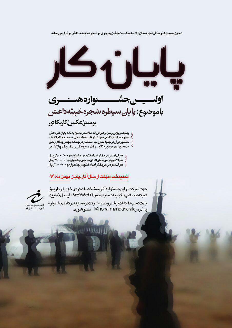 به گزارش سرویس استان های حلقه وصل، نخستین جشنواره هنری «پایان کار» با موضوع پایان شجره خبیثه داعش در اراک برگزار می گردد.