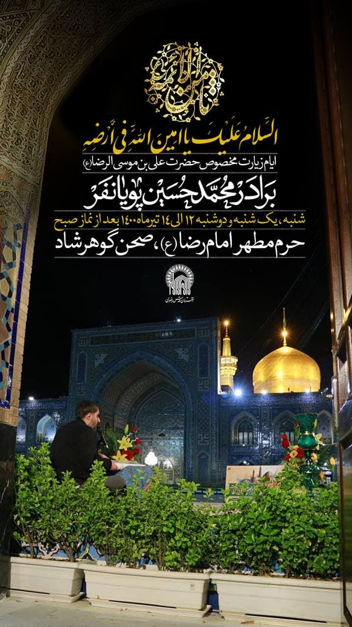 حلقه وصل: مراسم مناجاتخوانی حرم مطهر رضوی در ایام زیارت مخصوص حضرت رضا علیهالسلام به مدت ۳ روز با نوای محمدحسین پویانفر برگزار میشود.