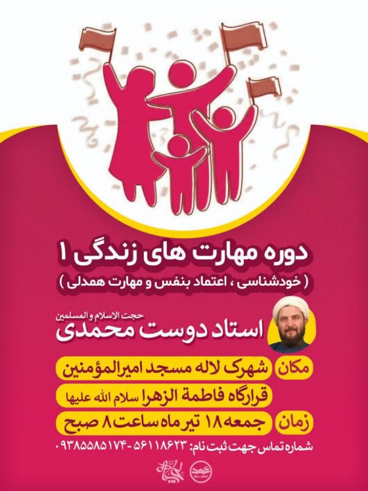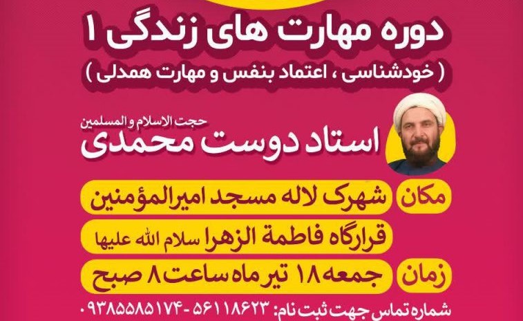 دوره مهارتهای زندگی در قرارگاه فاطمهالزهرا(س) واقع در اسلامشهر، شهرک لاله، مسجد امیرالمومنین(ع) برگزار میگردد.