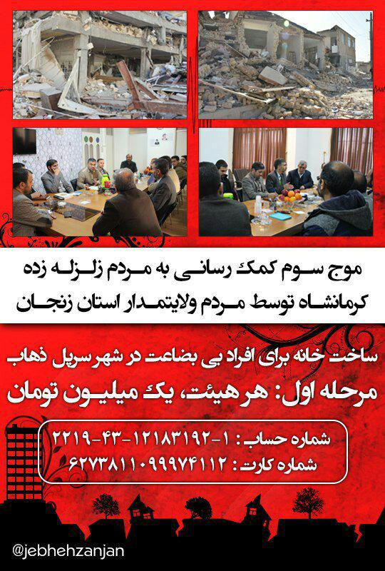 دبیر ستاد مردمی جبهه فرهنگی زنجان در ادامه به زلزله کرمانشاه و اقدامات این ستاد اشاره و اظهار داشت: بعد از وقوع زلزله که در مرحله نخست کمک های مردمی در قالب خوراک و پوشاک جمع آوری و با همکاری سپاه، گروه منادیان فتح و برخی مجموعه ها و گروه های فرهنگی مردمی در چند نوبت برای مناطق زلزله زده کرمانشاه ارسال شد.