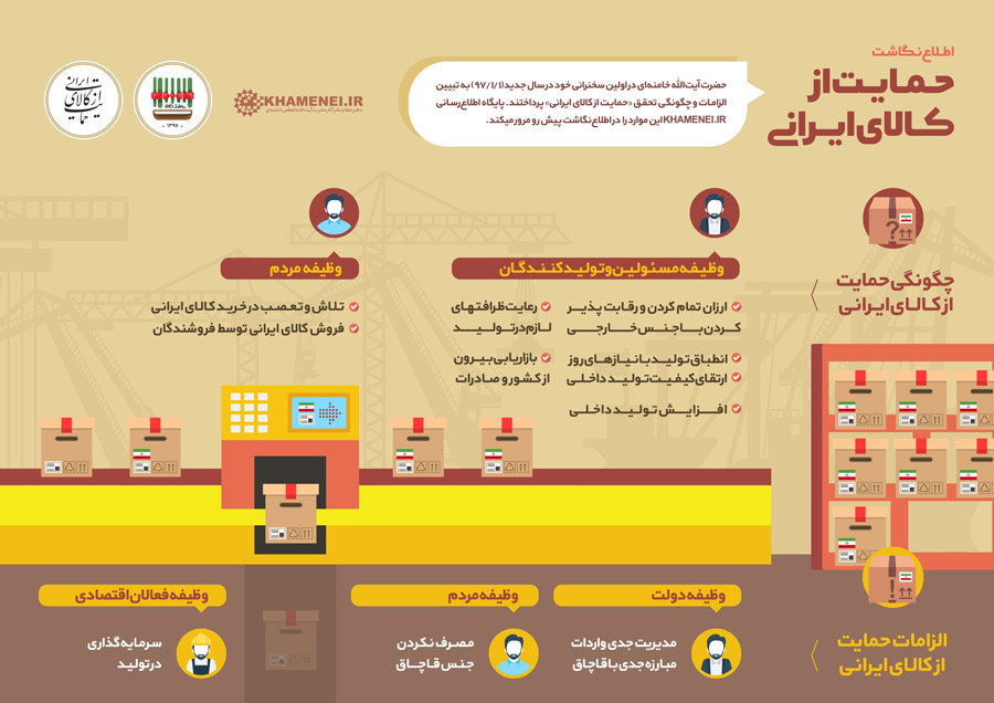 حضرت آیتالله خامنهای در اولین سخنراین خود در سال جدید (۱۳۹۷/۰۱/۰۱) به تبیین الزامات و چگونگی تحقق «حمایت از کالای ایرانی» پرداختند. پایگاه اطلاعرسانی KHAMENEI.IR این موارد را در اطلاعنگاشت پیشرو مرور کرد.