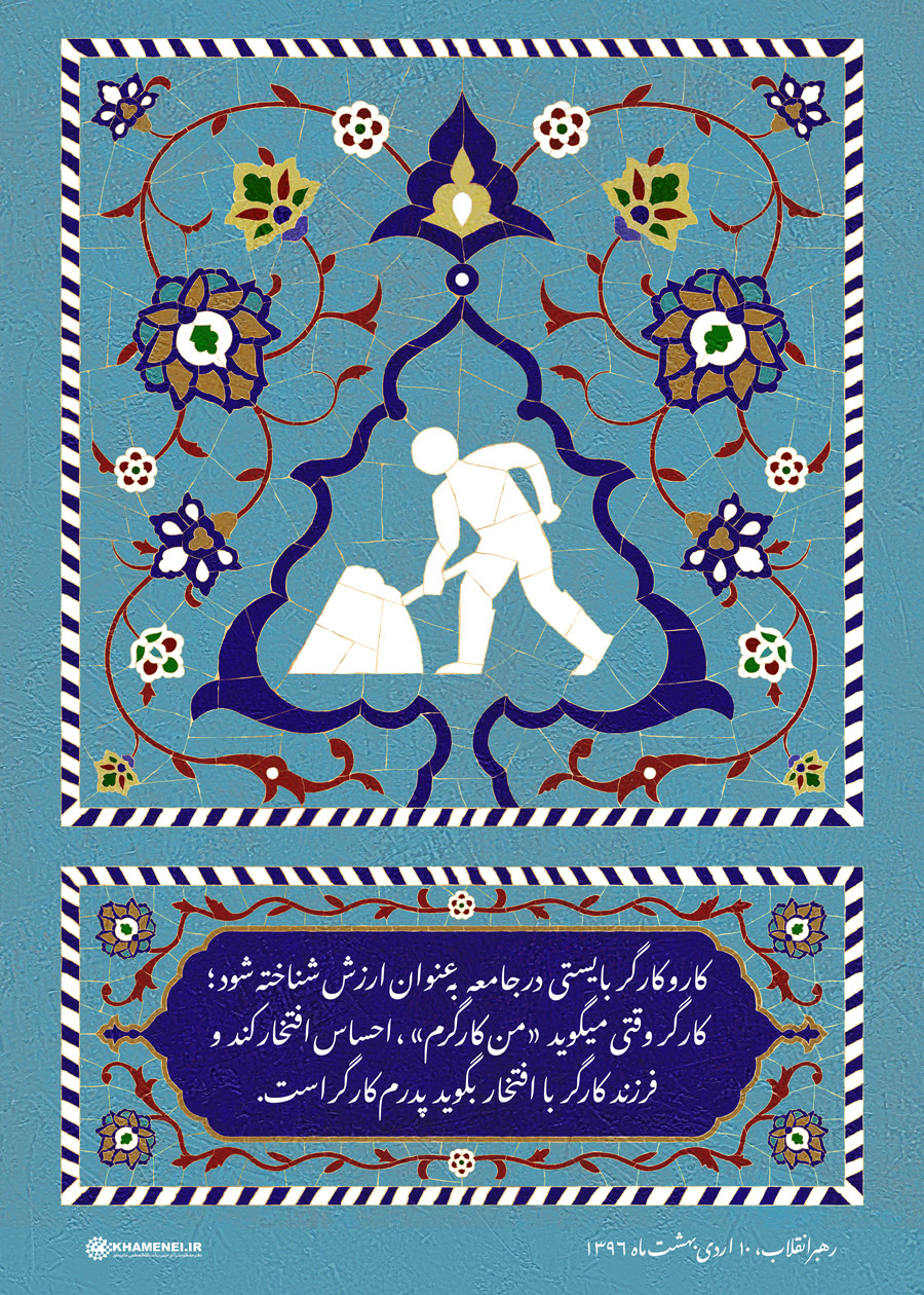 به گزارش حلقه وصل، حضرت آیتالله خامنهای: «کار و کارگر بایستی در جامعه به عنوان ارزش شناخته شود؛ کارگر وقتی میگوید «من کارگرم»، احساس افتخار کند و فرزند کارگر با افتخار بگوید پدرم کارگر است.» ۱۳۹۶/۰۲/۱۰