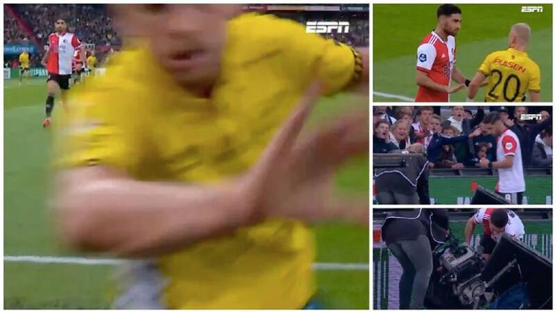 در ادامه این مطلب به ماجرا اشاره شده و آمده است: سیمون استرند سوئدی تعادل خود را در دوئلی در کنار زمین از دست داد و با دوربین فیلمبردار ESPN Sport برخورد کرد و دستگاه او را روی زمین کوبید. استرند سریع بلند شد و به زمین چمن برگشت، گویی هیچ اتفاقی نیفتاده است. او سپس با نگاه تند حریفش، علیرضا جهانبخش بازیکن فاینورد رو به رو شد.